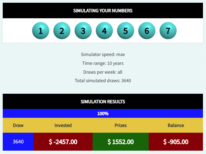 Over 10 years, your total spend would have reached around $2,457. But the outcome is far less exciting than you might expect: the simulation shows just $1,552 in winnings – leaving you with a net loss of -$905.
